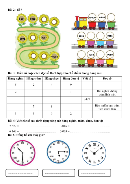 3: Đ ền s hoặ á ọc s thích h p vào chỗ chấm trong bảng sau: Hàng nghìn H tr Hàng chục H v Viết s Đọc s 5 2 4 9 2 1 Hai nghìn không trăm linh một 8427 7 8 Bốn nghìn bảy trăm tám mươi lăm 3 5 0 2