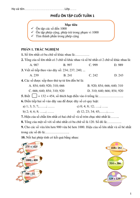 PHIẾU ÔN TẬP CUỐI TUẦN 1 Mục tiêu