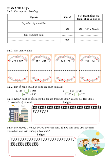 Bài 5. Một trường Tiểu học có 370 học sinh nam. Số học sinh nữ là 290 học sinh.