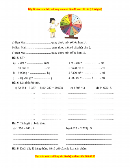 c) Bạn Mai ……………………. quay được một số bé hơn 15. Bài 5. Số? a) 7 dm = …………….. mm