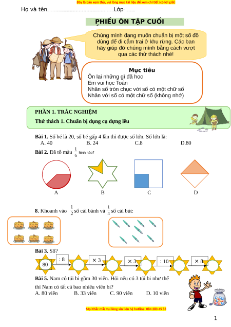 Bài 1. Số bé là 20, số bé gấp 4 lần thì được số lớn. Số lớn là: A. 40 B. 24 C.8 D.80
