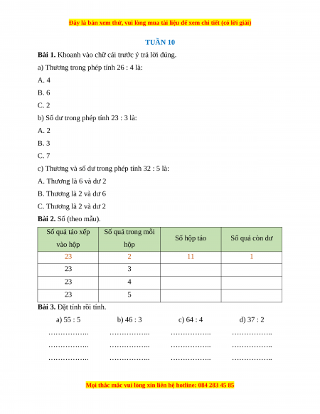 Bài 3. Đặt tính rồi tính. a) 55 : 5 b) 46 : 3 c) 64 : 4 d) 37 : 2 …………….. …………….. …………….. …………….. …………….. …………….. …………….. …………….. …………….. …………….. …………….. ……………..