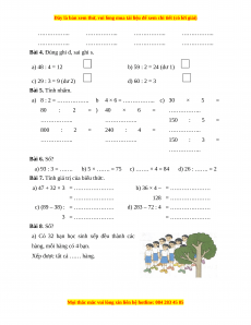 4 × 6 = …………….. c) 30 × 5 = 80 : 2 = ) 40 × 6 = …………….. …………….. …………….. 150 : 5 = 800 : 2 = 240 : 4 = …………….. …………….. …………….. 150 : 3 = …………….. Bài 6. Số? a) 93 : 3 = ……. b) 5 × ……. = 75 c) ……. × 4 = 84 d) 26 : ……. = 2