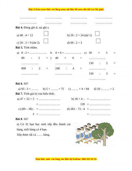 Bài 4. Đúng ghi đ, sai ghi s. a) 48 : 4 = 12 b) 59 : 2 = 24 (dư 1) c) 29 : 3 = 9 (dư 2) d) 60 : 2 = 3 Bài 5. Tính nhẩm. a) 8 : 2 = …………….. b