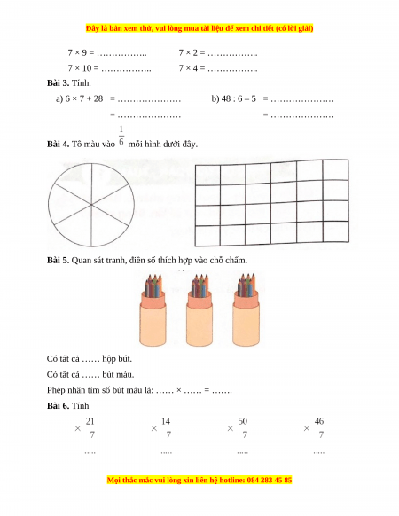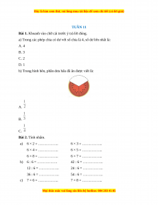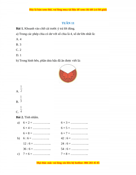 b) Trong hình bên, phần dưa hấu đã ăn được viết là: A. B. C. Bài 2. Tính nhẩm. a) 6 × 2 = …………….. 6 × 3 = …………….. 6 × 4 = …………….. 6 × 5 = …………….. 6 × 8 = …………….. 6 × 7 = …………….. b) 6 : 6 = …………….. 42 : 6 = …………….. 12 : 6 = …………….. 24 : 6 = …………….. 36 : 6 = …………….. 54 : 6 = …………….. c) 7 × 6 = …………….. 7 × 8 = ……………..