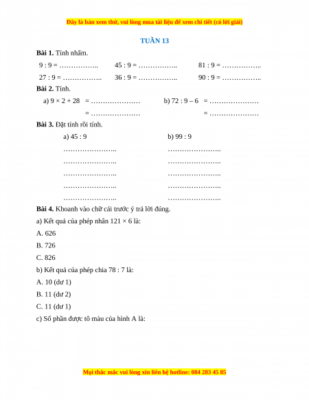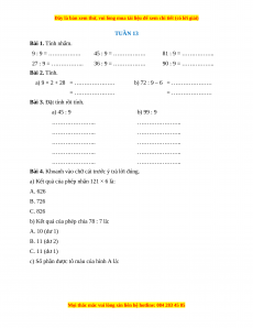 TUẦN 13 Bài 1. Tính nhẩm. 9 : 9 = …………….. 45 : 9 = …………….. 81 : 9 = …………….. 27 : 9 = …………….. 36 : 9 = …………….. 90 : 9 = …………….. Bài 2. Tính.
