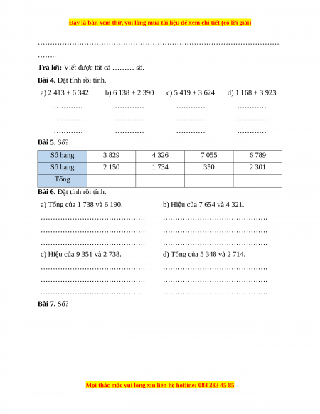 Bài 4. Đặt tính rồi tính. a) 2 413 + 6 342 b) 6 138 + 2 390 c) 5 419 + 3 624 d) 1 168 + 3 923 ………… ………… ………… ………… ………… ………… ………… ………… ………… ………… ………… ………… Bài 5. Số? Số hạng 3 829 4 326 7 055 6 789 Số hạng 2 150 1 734 350 2 301 Tổng