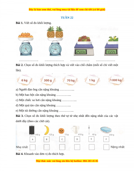 Bài 2. Chọn số đo khối lượng thích hợp và viết vào chỗ chấm (mỗi số chỉ viết một lần).