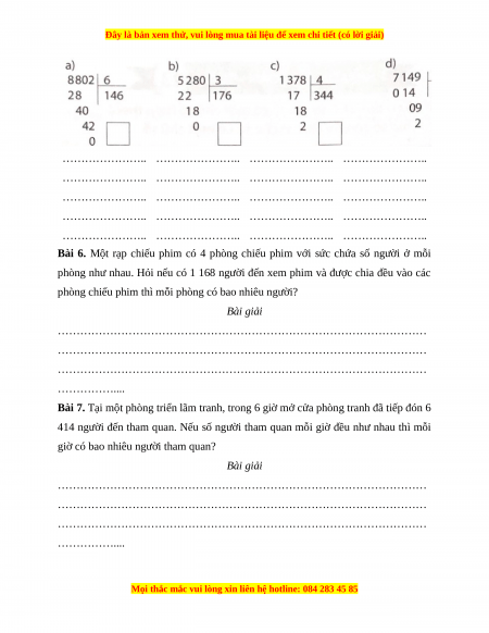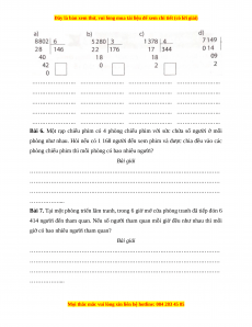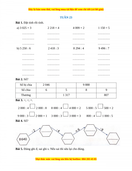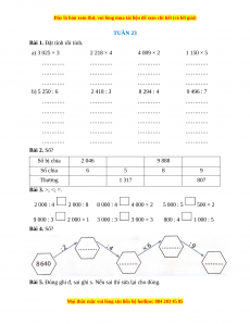 Bài 1. Đặt tính rồi tính. a) 3 025 × 3 2 218 × 4 4 009 × 2 1 150 × 5 ………… ………… ………… ………… ………… ………… ………… ………… ………… ………… ………… ………… b) 5 250 : 6 2 418 : 3 8 294 : 4 9 496 : 7 ………… ………… ………… ………… ………… ………… ………… ………… ………… ………… ………… ………… ………… ………… ………… ………… ………… ………… ………… ………… Bài 2. Số? Số bị chia 2 046 9 888 Số chia 6 5 8 9 Thương 1 317 807 Bài 3. >; <; =. 2 000 : 4 2 000 : 8 8 000 : 4 4 000 × 2 5 000 : 5 500 × 2 9 000 : 3 2 000 × 1 3 000 : 3 3 000 × 3 800 : 4 1 000 : 5 Bài 4. Số?