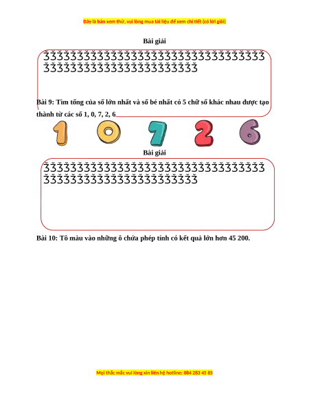 Bài 3. Hiệu của số lớn nhất có năm chữ số khác nhau và số nhỏ nhất có năm chữ số là: A. 89 999 B. 88 765 C. 88 760 D. 90 000