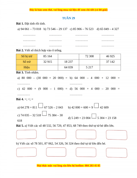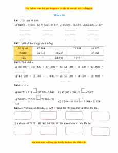 Bài 2. Viết số thích hợp vào ô trống. Số bị trừ 85 164 72 308 46 925 Số trừ 32 915 18 237 37 142 Hiệu 64 039 5 217 Bài 3. Tính nhẩm.