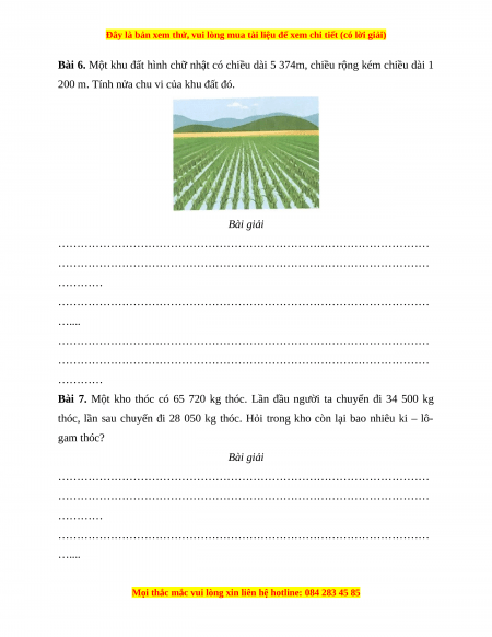 Bài 6. Một khu đất hình chữ nhật có chiều dài 5 374m, chiều rộng kém chiều dài 1