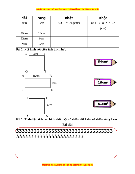 Bài 3: Tính diện tích của hình chữ nhật có chiều dài 3 dm và chiều rộng 9 cm. Bài giải