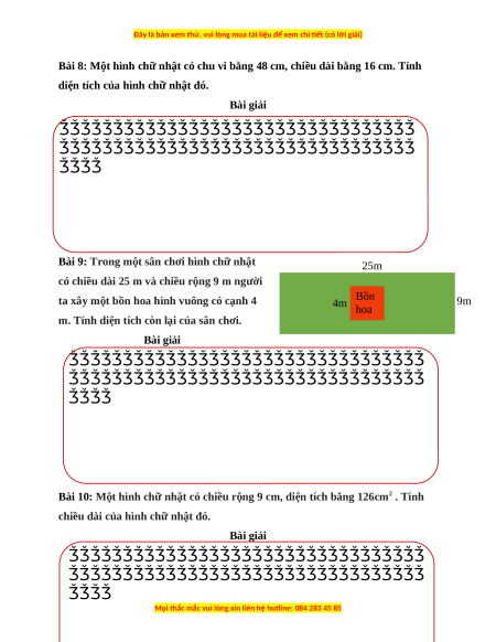 Bài 6: Khu vườn nhà Lan hình chữ nhật có chiều dài 45 m, chiều rộng bằng 9