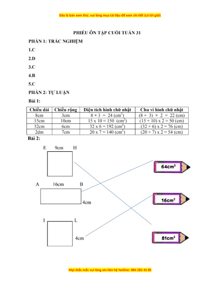 A. 140cm2 B. 13dm2 C. 135cm2 D. 21cm2 PHẦN 2: TỰ LUẬN