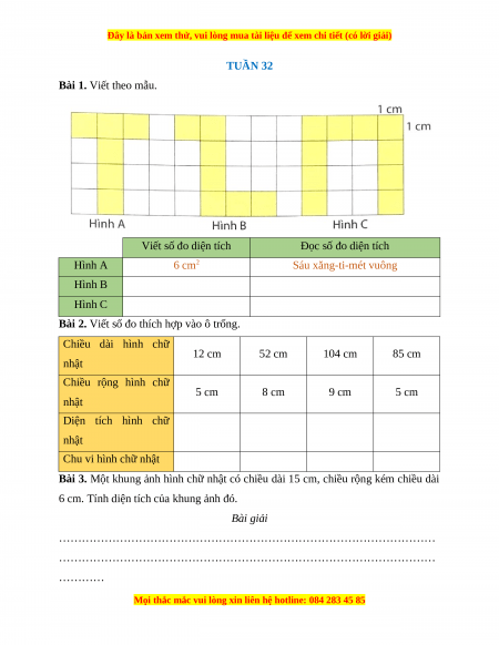 Bài 2. Viết số đo thích hợp vào ô trống. Chiều dài hình chữ 12 cm 52 cm 104 cm 85 cm nhật Chiều rộng hình chữ 5 cm 8 cm 9 cm 5 cm nhật Diện tích hình chữ nhật Chu vi hình chữ nhật