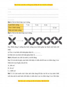 Bài 4. Viết số thích hợp vào ô trống. Cạnh hình vuông 7 cm 5 cm 4 cm Chu vi hình vuông 12 cm Diện tích hình vuông