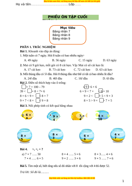 Họ và tên:………………………………………………………Lớp:………. PHIẾU ÔN TẬP CUỐI TUẦN 4 Mục tiêu Bảng nhân 7 Bảng nhân 8 Bảng nhân 9 PHẦN 1. TRẮC NGHIỆM