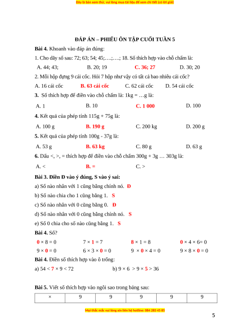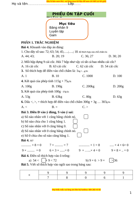 Họ và tên:………………………………………………………Lớp:………. PHIẾU ÔN TẬP CUỐI TUẦN 5 Mục tiêu Bảng nhân 9 Luyện tập Gam PHẦN 1. TRẮC NGHIỆM