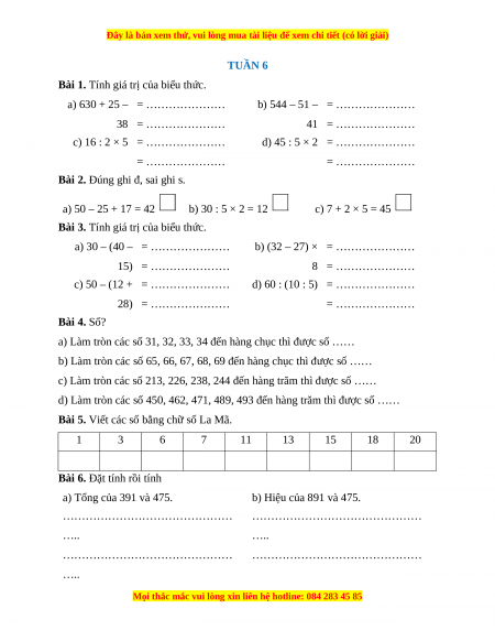 Bài 6. Đặt tính rồi tính a) Tổng của 391 và 475. b) Hiệu của 891 và 475.
