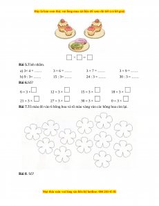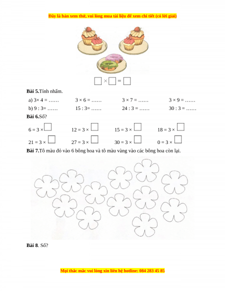 Bài 5.Tính nhẩm. a) 3× 4 = …… 3 × 6 = …… 3 × 7 = …… 3 × 9 = …… b) 9 : 3= …… 15 : 3= …… 24 : 3 = …… 30 : 3 = …… Bài 6.Số? 6 = 3 × 12 = 3 × 15 = 3 × 18 = 3 × 21 = 3 × 27 = 3 × 30 = 3 × 0 = 3 ×