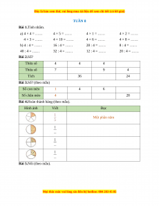 TUẦN 8 Bài 1.Tính nhẩm. a) 4 × 4 = …… 4 × 5 = …… 4 × 1 = …… 4 × 2 = …… 4 × 3 = …… 4 × 10 = …… 4 × 6 = …… 4 × 8 = …… b) 4 : 4 = …… 16 : 4 = …… 28 : 4 = …… 8 : 4 = …… 40 : 4 = …… 32 : 4 = …… 12 : 4 = …… 20 : 4 = …… Bài 2.Số? Thừa số 4 4 4 Thừa số 7 9 4 Tích 36 24