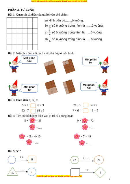 Bài 4. Tìm số thích hợp điền vào vị trí của bông hoa: 5 × = 25 9 × = 72 =…. =…. × 5 = 4×10 × 7 = 49 =…. =…. Bài 5. Số? : 6 : … 8 72 72 9 : … : 7 7 35 4