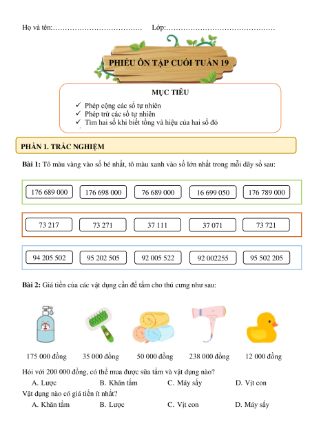 PHIẾU ÔN TẬP CUỐI TUẦN 19 MỤC TIÊU