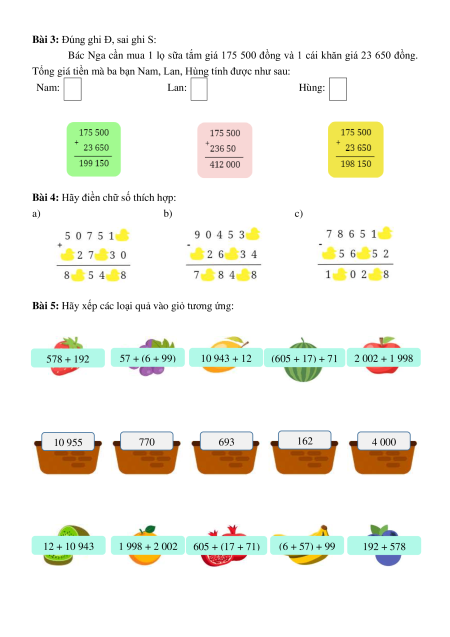 Bài 5: Hãy xếp các loại quả vào giỏ tương ứng: 578 + 192 57 + (6 + 99) 10 943 + 12 (605 + 17) + 71 2 002 + 1 998 10 955 770 693 162 4 000 12 + 10 943 1 998 + 2 002 605 + (17 + 71) (6 + 57) + 99 192 + 578 PHẦN 2. TỰ LUẬN