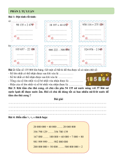 Bài 1: Đặt tính rồi tính: a) 98 135 + 2 479 18 197 + 44 432 958 116 + 275 129 ……………… ……………… ……………… ……………… ……………… ……………… ……………… ……………… ……………… b) 103 657 – 22 108 666 222 – 308 090 524 976 – 2 545 ……………… ……………… ……………… ……………… ……………… ……………… ……………… ……………… ………………