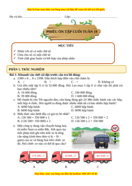 PHIẾU ÔN TẬP CUỐI TUẦN 19 MỤC TIÊU