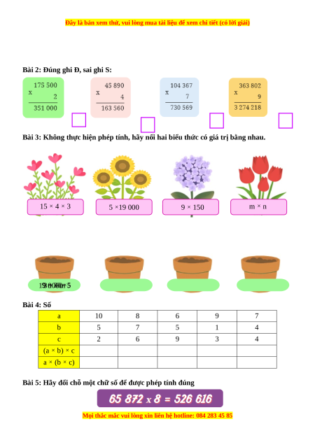 Bài 3: Không thực hiện phép tính, hãy nối hai biểu thức có giá trị bằng nhau. 15 × 4 × 3 5 ×19 000 9 × 150 m × n 19 000 9 n 3 × × × × 60 30 m 5 × Bài 4: Số a 10 8 6 9 7 b 5 7 5 1 4 c 2 6 9 3 4 (a × b) × c a × (b × c)
