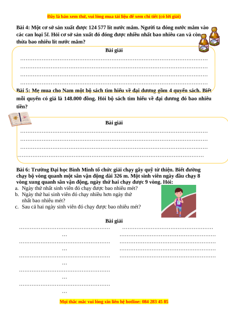 Bài 4: Một cơ sở sản xuất được 124 577 lít nước mắm. Người ta đóng nước mắm vào