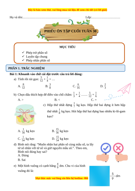PHIẾU ÔN TẬP CUỐI TUẦN 30 MỤC TIÊU Phép trừ phân số Luyện tập chung Phép nhân phân số