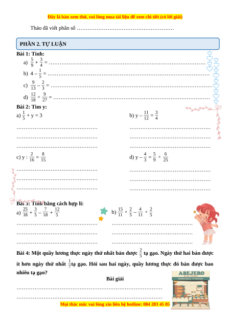 Thảo đã viết phân số ……………………………………………… PHẦN 2. TỰ LUẬN Bài 1: Tính: 5 3 a)