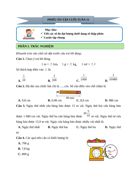 PHIẾU ÔN TẬP CUỐI TUẦN 13 Mục tiêu: