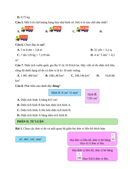 Câu 5. Mỗi ô tô chở lượng hàng hóa như hình vẽ. Hỏi ô tô nào chở nhẹ nhất? 2,1 tấn 25 tạ 1,2 tấn 15 tạ A. B. C. D.