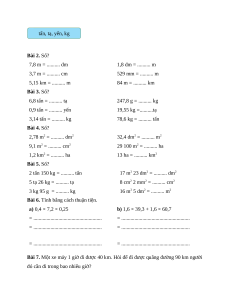 Hai đơn vị liền kề, đơn vị bé bằng (hay 0,01) đơn vị lớn. tấn, tạ, yến, kg Bài 2. Số? 7,8 m = .......... dm 1,8 dm = .......... m 3,7 m = .......... cm 529 mm = .......... m 5,15 km = .......... m 84 m = .......... km Bài 3. Số? 6,8 tấn = .......... tạ 247,8 g = .......... kg 0,9 tấn = .......... yến 19,55 kg =..........tạ 3,14 tấn = .......... kg 78,6 kg = .......... tấn Bài 4. Số? 2,78 m2 = .......... dm2 32,4 dm2 = .......... m2 9,1 m2 = .......... cm2 29 100 m2 = .......... ha 1,2 km2 = .......... ha 13 ha = .......... km2 Bài 5. Số?