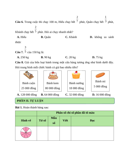 Hỏi trung bình mỗi chiếc bánh có giá bao nhiêu tiền? Bánh mì Bánh cuộn Bánh kem Bánh nướng 5 000 đồng 25 000 đồng 80 000 đồng 18 000 đồng A. 128 000 đồng B. 64 000 đồng C. 32 000 đồng D. 16 000 đồng PHẦN II. TỰ LUẬN