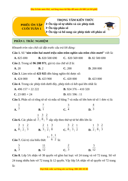 PHIẾU ÔN TẬP Ôn tập số tự nhiên và các phép tính CUỐI TUẦN 1 Ôn tập phân số
