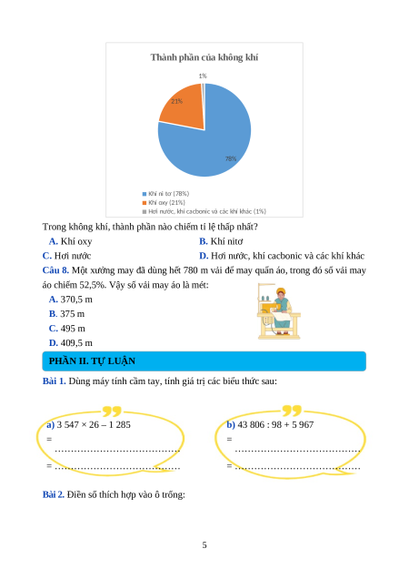 Câu 7. Biểu đồ dưới đây biểu diễn tỉ lệ theo thể tích trong không khí của: khí oxy;