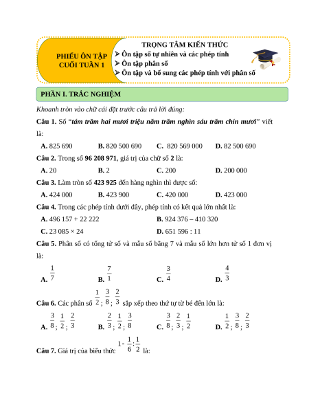 PHIẾU ÔN TẬP Ôn tập số tự nhiên và các phép tính CUỐI TUẦN 1 Ôn tập phân số