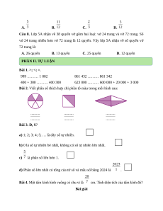 vở 24 trang nhiều hơn vở 72 trang là 12 quyển. Vậy lớp 5A nhận về số quyển vở 72 trang là: A. 26 quyển B. 13 quyển C. 25 quyển D. 12 quyển PHẦN II. TỰ LUẬN Bài 1. >; <; =. 999 ……… 1 002 861 432 ……… 861 342 400 + 300 ……… 400 300