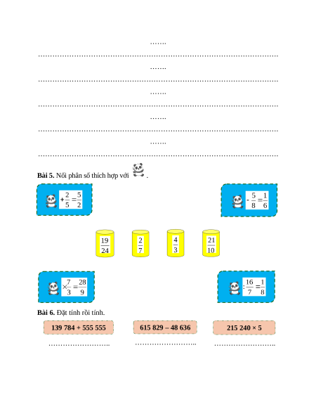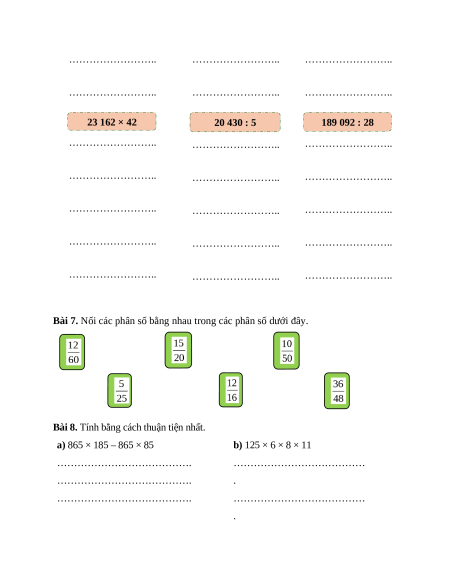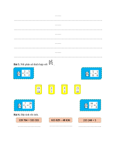 Bài 6. Đặt tính rồi tính. 139 784 + 555 555 615 829 – 48 636 215 240 × 5 …………………….. …………………….. …………………….. …………………….. …………………….. …………………….. …………………….. …………………….. …………………….. 23 162 × 42 20 430 : 5 189 092 : 28 …………………….. …………………….. …………………….. …………………….. …………………….. …………………….. …………………….. …………………….. …………………….. …………………….. …………………….. …………………….. …………………….. …………………….. ……………………..