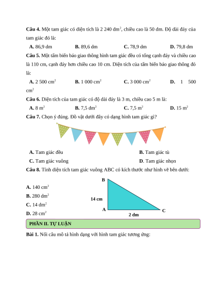 Câu 8. Tính diện tích tam giác vuông ABC có kích thước như hình vẽ bên dưới: B A. 140 cm2 B. 280 dm2 14 cm C. 14 dm2 A D. 28 cm2 C 2 dm PHẦN II. TỰ LUẬN