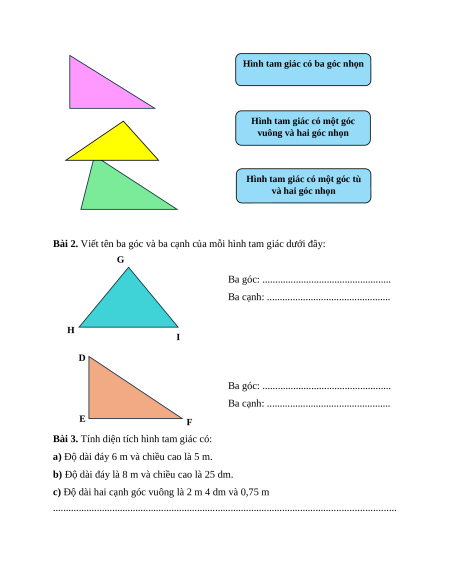 Bài 2. Viết tên ba góc và ba cạnh của mỗi hình tam giác dưới đây: G
