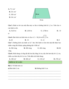 chiều cao kém đáy bé 2,4 cm. Tính diện tích hình thang A. 108 cm2 B. 508 cm2 C. 218 cm2 D. 278 cm2 PHẦN II. TỰ LUẬN