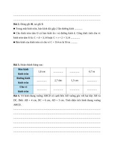 Bài 3. Hoàn thành bảng sau: Bán kính 1,8 cm ............... ............... 0,7 m hình tròn Đường kính ............... 2,7 dm 1,5 cm ............... hình tròn Chu vi ............... ............... ............... ............... hình tròn