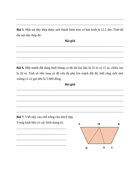 Bài 6. Một mảnh đất dạng hình thang có độ dài hai đáy là 35 m và 15 m, chiều cao