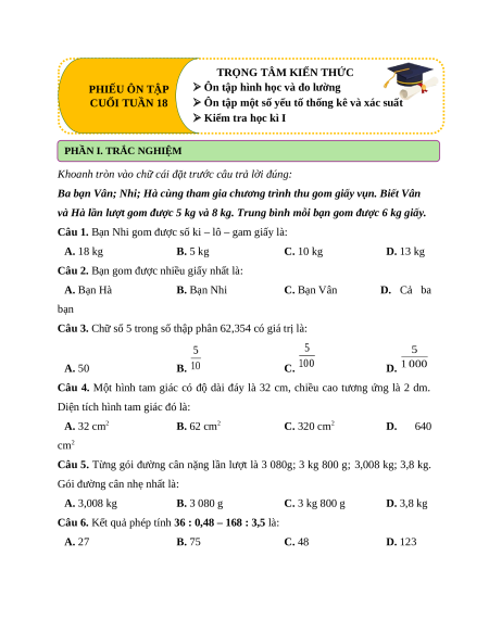 Câu 1. Bạn Nhi gom được số ki – lô – gam giấy là: A. 18 kg B. 5 kg C. 10 kg D. 13 kg